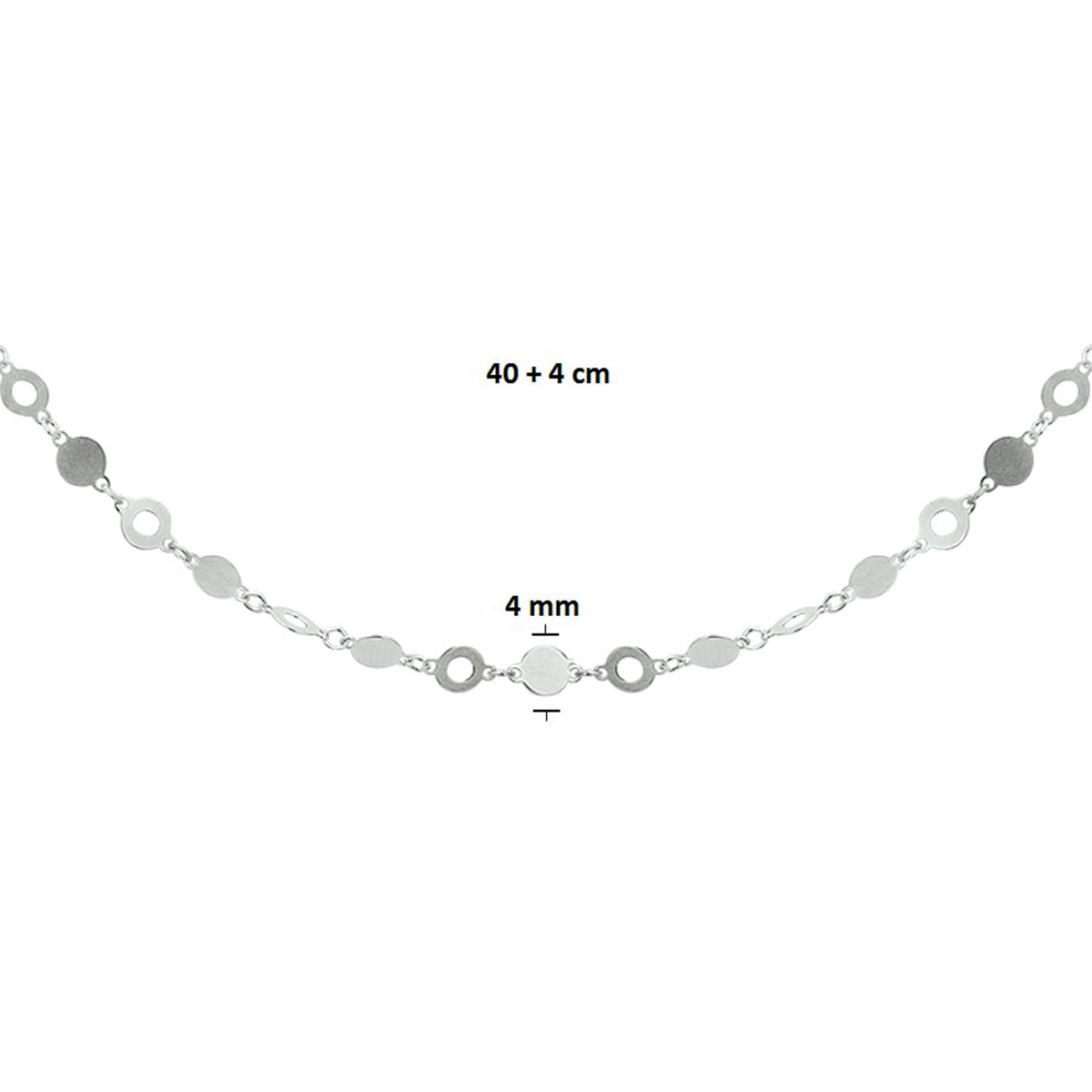 De collier is gemaakt van gerhodineerd zilver en is zilverkleurig. Het is een sieraad voor dames.