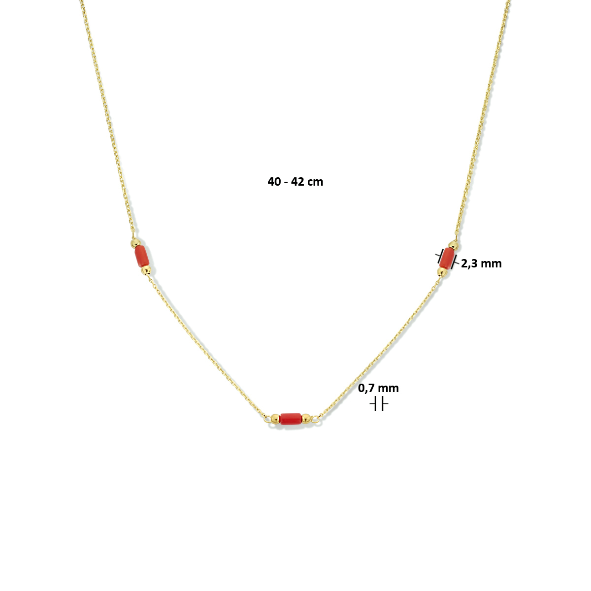 14k Geelgouden collier uitgevoerd met bloedkoraal. Het collier heeft een breedte van 2.3mm en draaglengtes van 40 en 42cm.