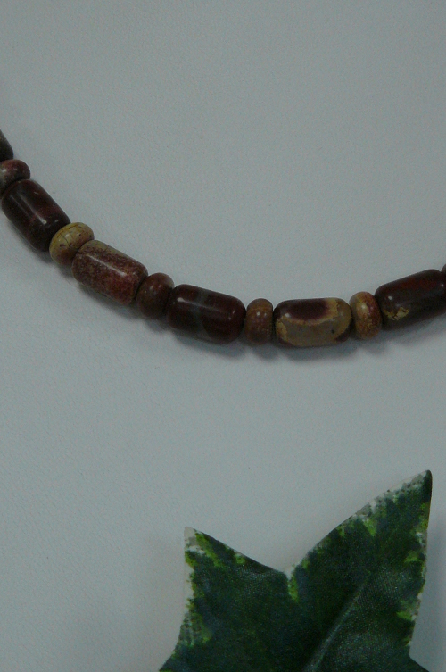 Set van Collier, Armband en Oorhangers van bijzondere Jaspis kralen op staaldraad geregen met gouden sluiting en oorhaken.