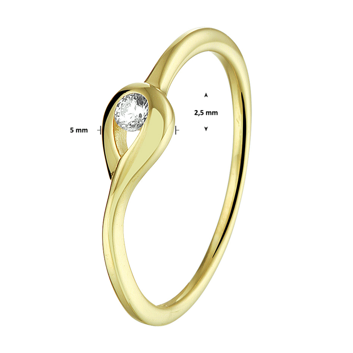 Stijlvolle geelgouden ring uitgevoerd met zirkonia en met een breedte van 5mm. De ring is goed te combineren met identiek gevormde sieraden uit onze collectie waarmee je een chique set kunt maken. Mt 17.25