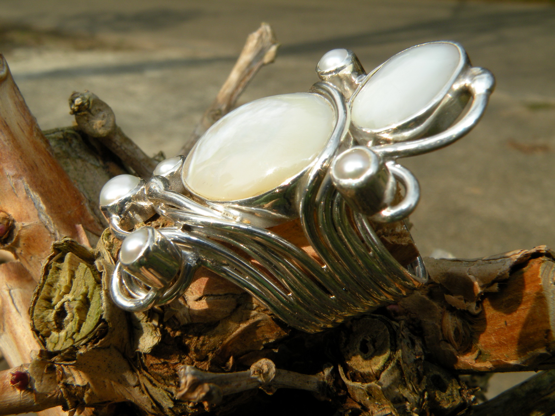Zilveren bijzondere ring met Parelmoer. Maat 19